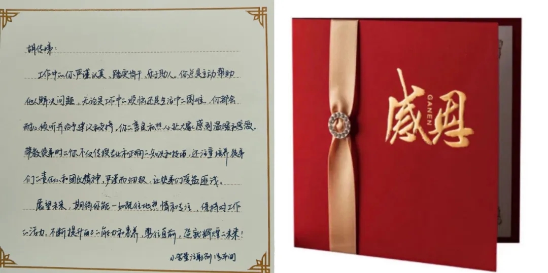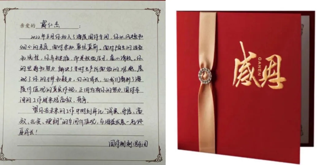 海陵衷心對他們的付出表示感謝,并為其準備了感恩卡和禮物,直屬領導“驚喜出現(xiàn)”,將手寫感謝卡和禮物交給他們!