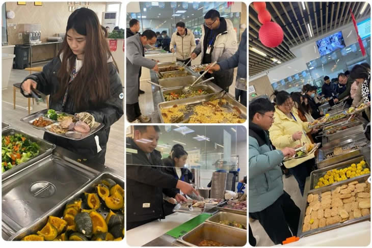 菜名吉利、美味豐盛的各色美食次序排開。大家一時(shí)難以抉擇,紛紛表示“我全都要”。餐盤中,海鮮肉食、清爽鮮蔬、精美糕點(diǎn)、甜蜜水果很快摞起一座高高的小山?!靶虏松峡?!”司務(wù)長一聲吆喝,又引得無數(shù)圍觀,好不熱鬧。